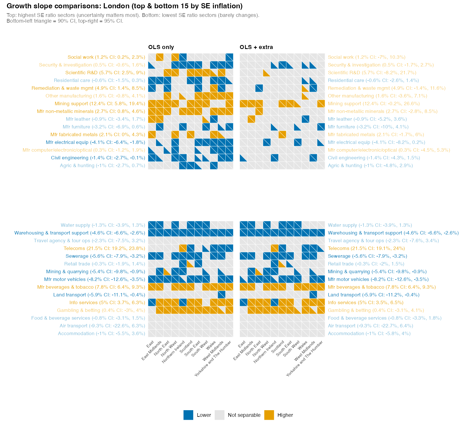 This time, the top and bottom triangles in each grid are ‘slopes differ at 90% and 95% confidence levels’. 90% is indicated with a triangle in the bottom left of each grid square. This is a lower bar. The stricter 95% level is top right. So for example: looking near the top of the bottom half, warehousing and transport support has each triangle full, across all ITL1 comparators - and they are blue, so slopes are separably lower than those places, at both 90 and 95% levels. This sector does look to have shrunk, and clearly more so than anywhere else.