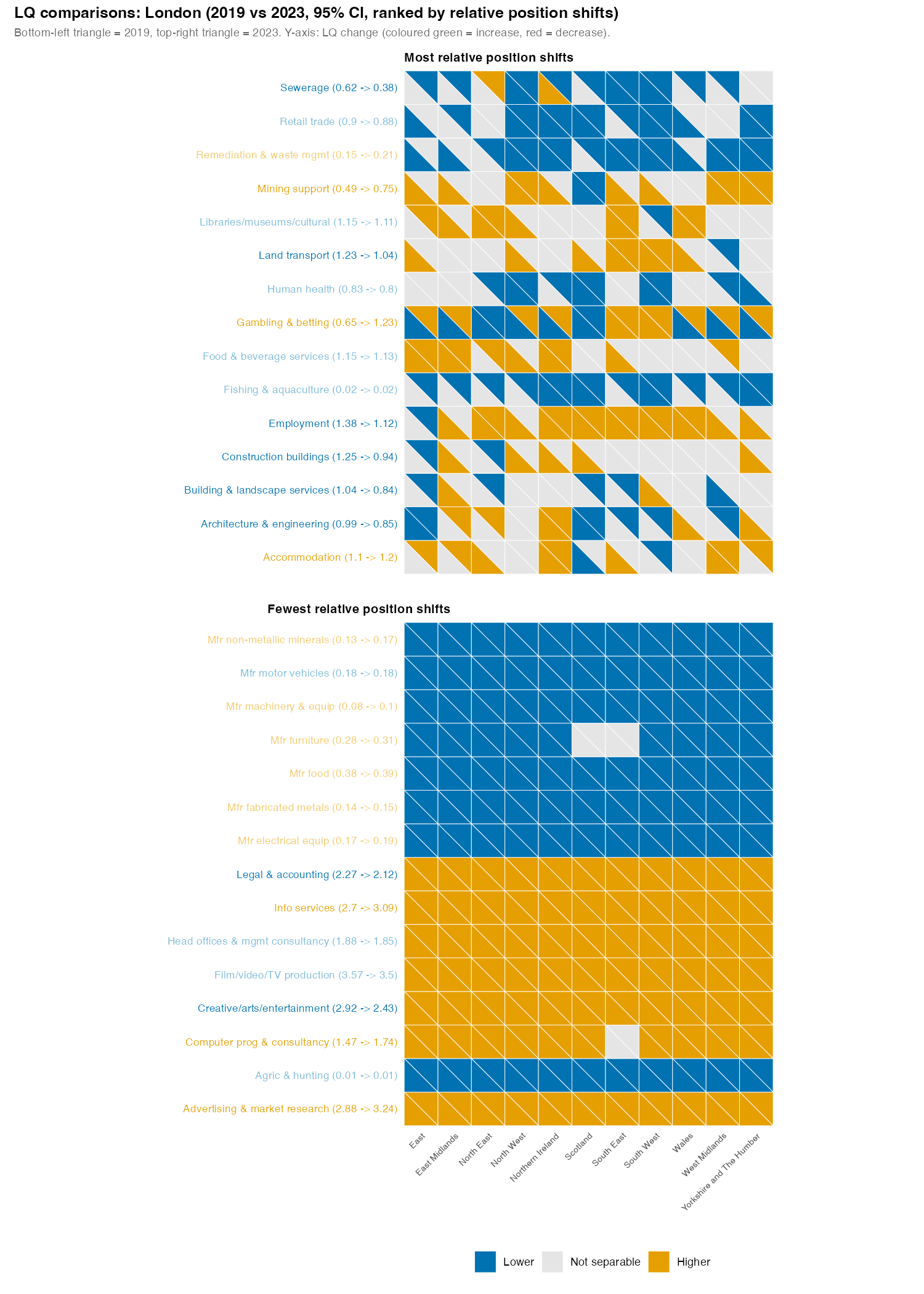 The bottom-left triangles in each square show if London’s LQ in 2019 was lower (blue) or higher (orange)5 than that sector in the other ITL1s, or not separable (using a z test to compare the difference between the two LQ values). The top-right triangles show the same for 2023.