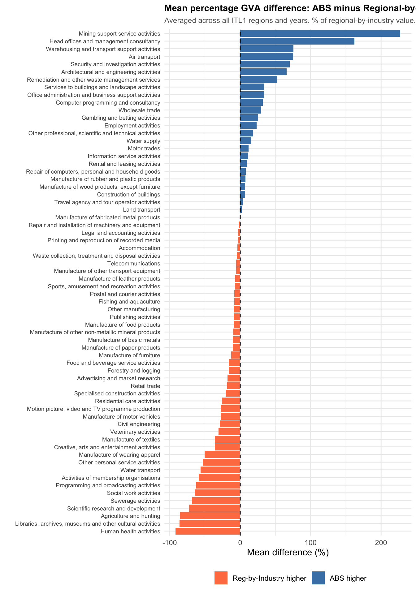 Note, single-point GVA values in the ABS can be quite different to the official region-by-industry GVA. Figure 7 summarises the average percent difference per sector between these two data sources (where single-sector matches exist). This figure is a visual reflection of the differences arising from the top-down national accounts balancing process, compared to survey data; understanding the differences would require a clearer view into the complexity the ONS cite as the barrier to ever including error rates.